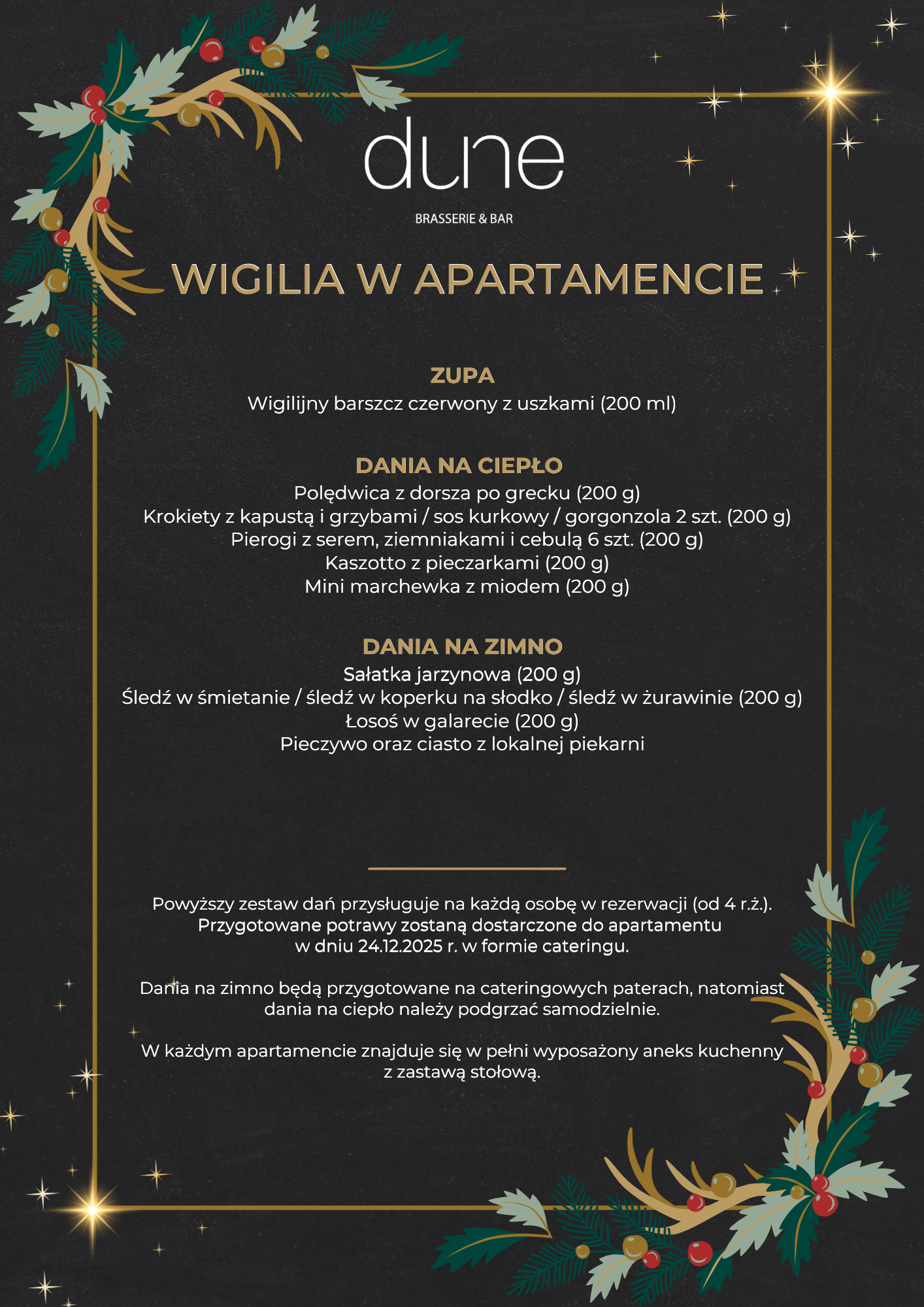 - UROCZYSTA KOLACJA WIGILIJNA W APARTAMENCIE w gronie najbliższych (zamiast obiadokolacji 24.12.2025). Przygotowane przez Szefa Kuchni potrawy zostaną dostarczone do apartamentu w Wigilię w formie cateringu do samodzielnego podgrzania,*