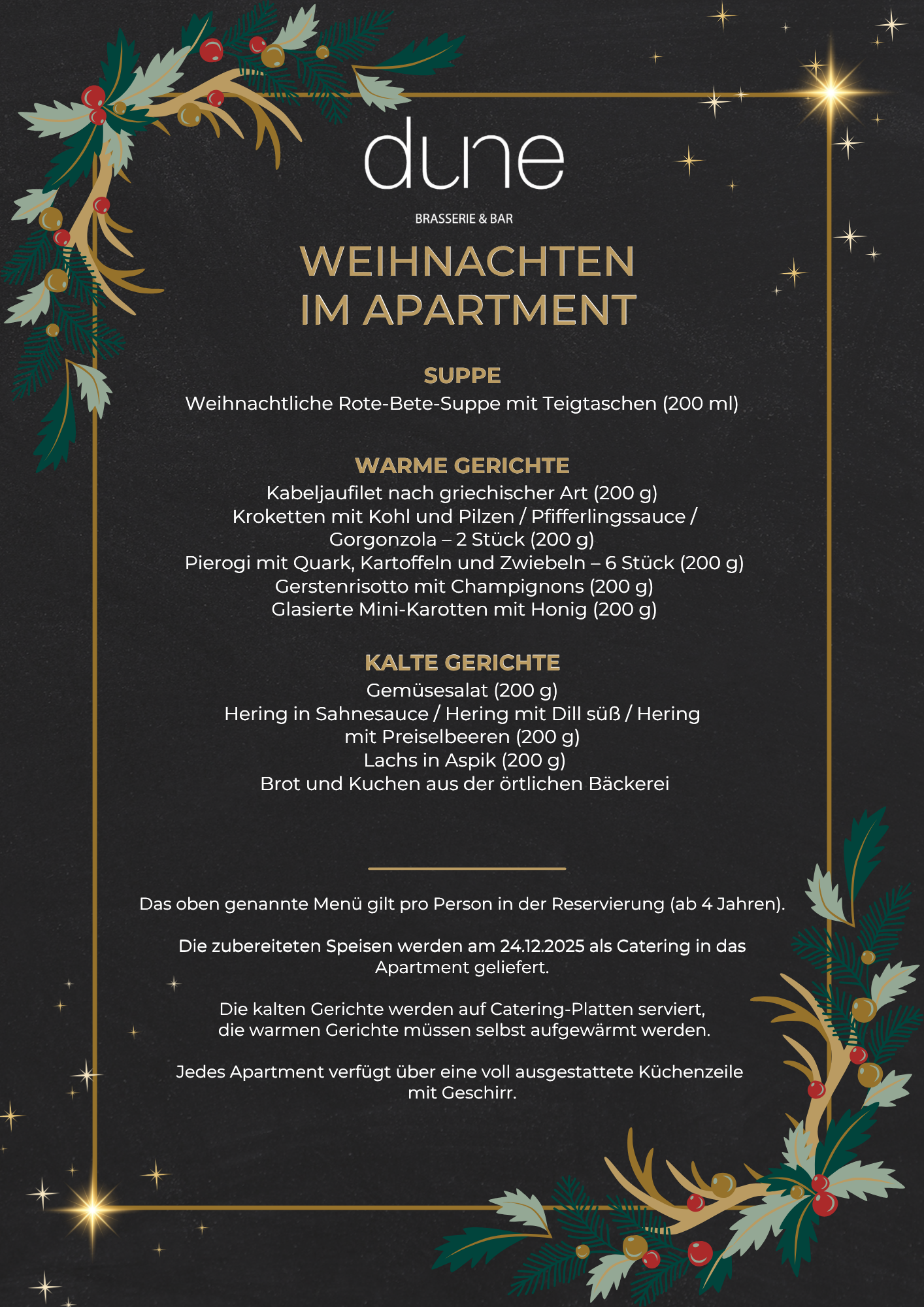 - FEIERLICHES WEIHNACHTSABENDESSEN IM APARTMENT im Kreise der Liebsten (statt Abendessen am 24.12.2025). Die vom Küchenchef vorbereiteten Gerichte werden an Heiligabend als Catering geliefert und müssen selbst aufgewärmt werden,*