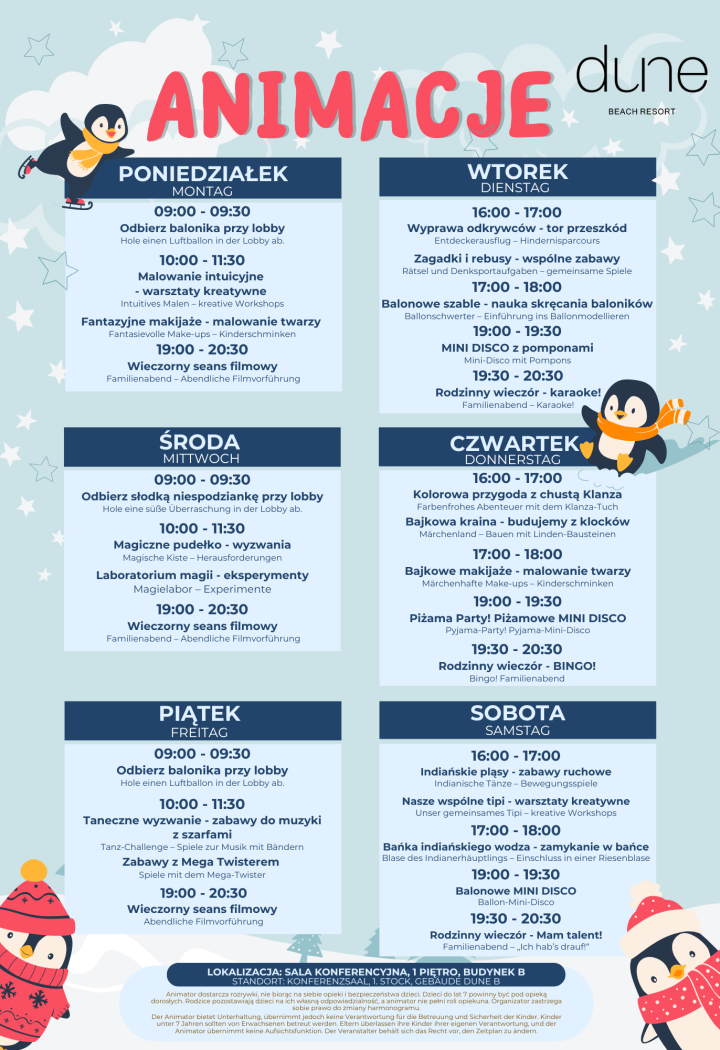 - Der Animator sorgt für Unterhaltung, übernimmt jedoch nicht die Aufsicht und Sicherheit der Kinder. Kinder unter 7 Jahren sollten von Erwachsenen beaufsichtigt werden. Eltern lassen ihre Kinder auf eigene Verantwortung, und der Animator fungiert nicht als Betreuer. Der Veranstalter behält sich das Recht vor, den Zeitplan zu ändern.