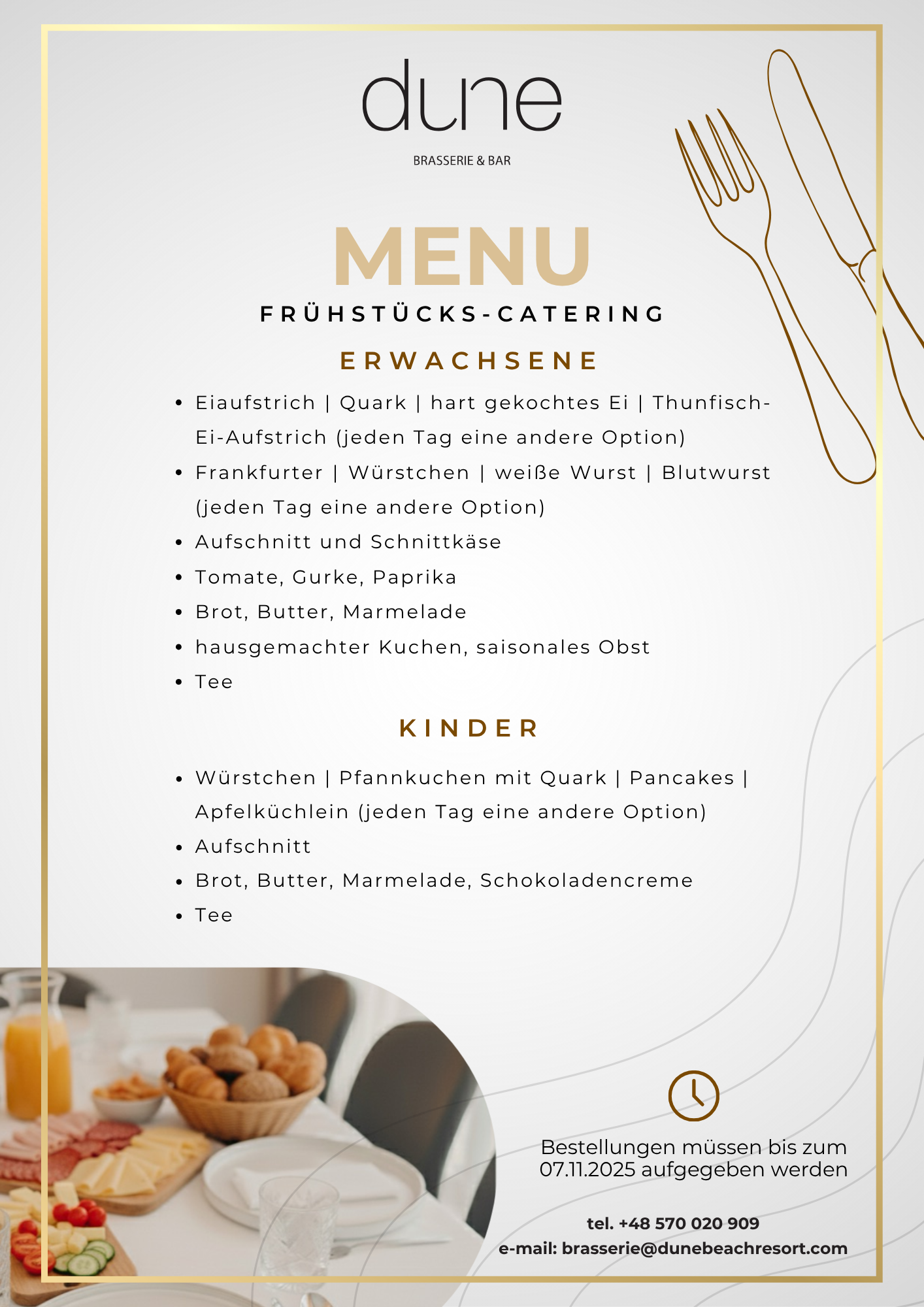 - Frühstück in Form eines Caterings, serviert ins Apartment*,