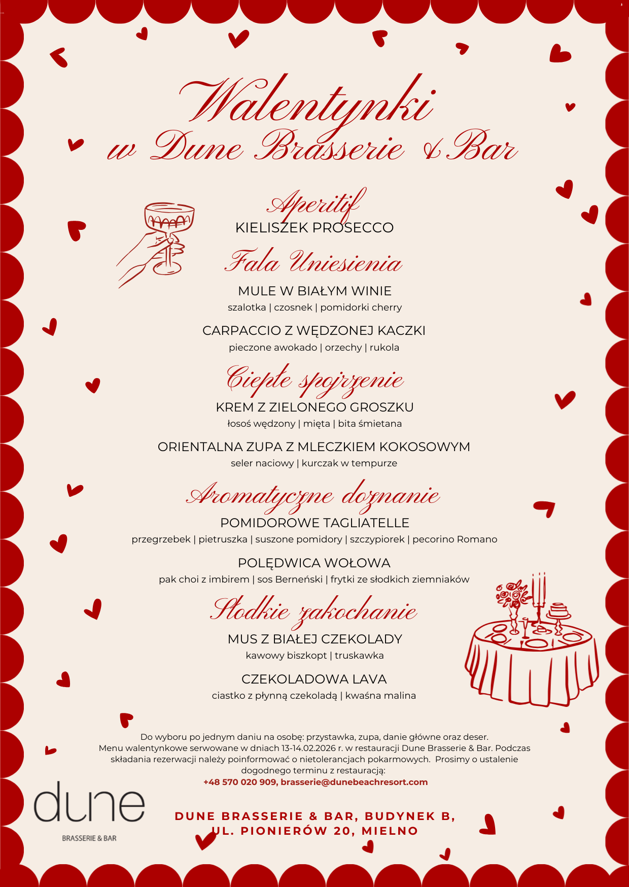 *Prosimy o ustalenie z recepcją dnia i godziny rezerwacji stolika w restauracji. Kolacja będzie odbywać się w dwóch turach: 18:30–20:30 oraz 20:30–22:30. Podczas składania rezerwacji prosimy również poinformować o nietolerancjach pokarmowych. Szczegółowe menu walentynkowe dostępne w dniach 13 i 14.02.2026.