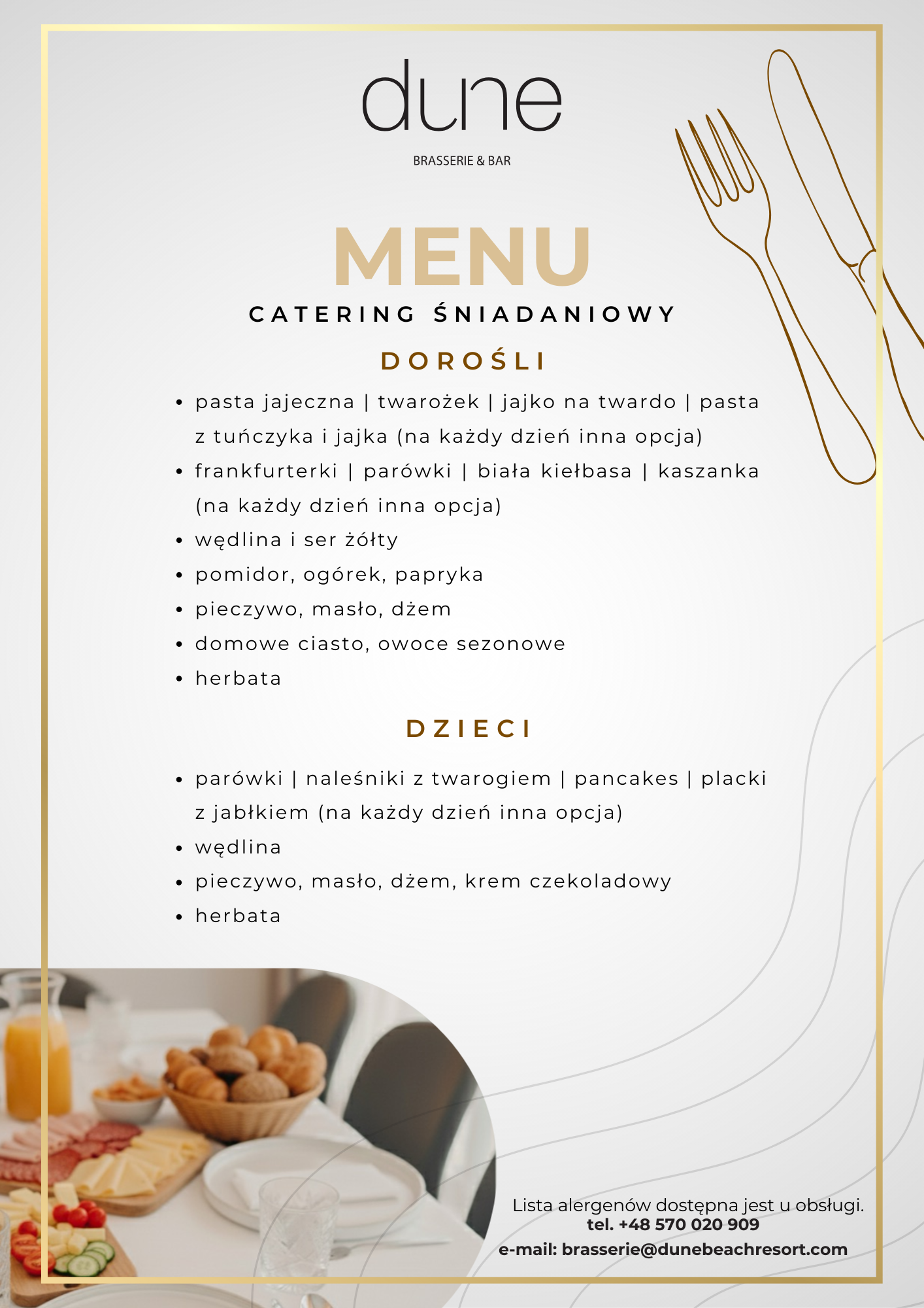 - śniadania w formie bufetu (woda, sok, herbata, kawa w cenie) w restauracji Dune Brasserie & Bar przy ulicy Pionierów 20 (śniadania odbywają się w turach: I 8:00, II 9:00, III 10:00, IV 11:00, tury trwają po 1 h),