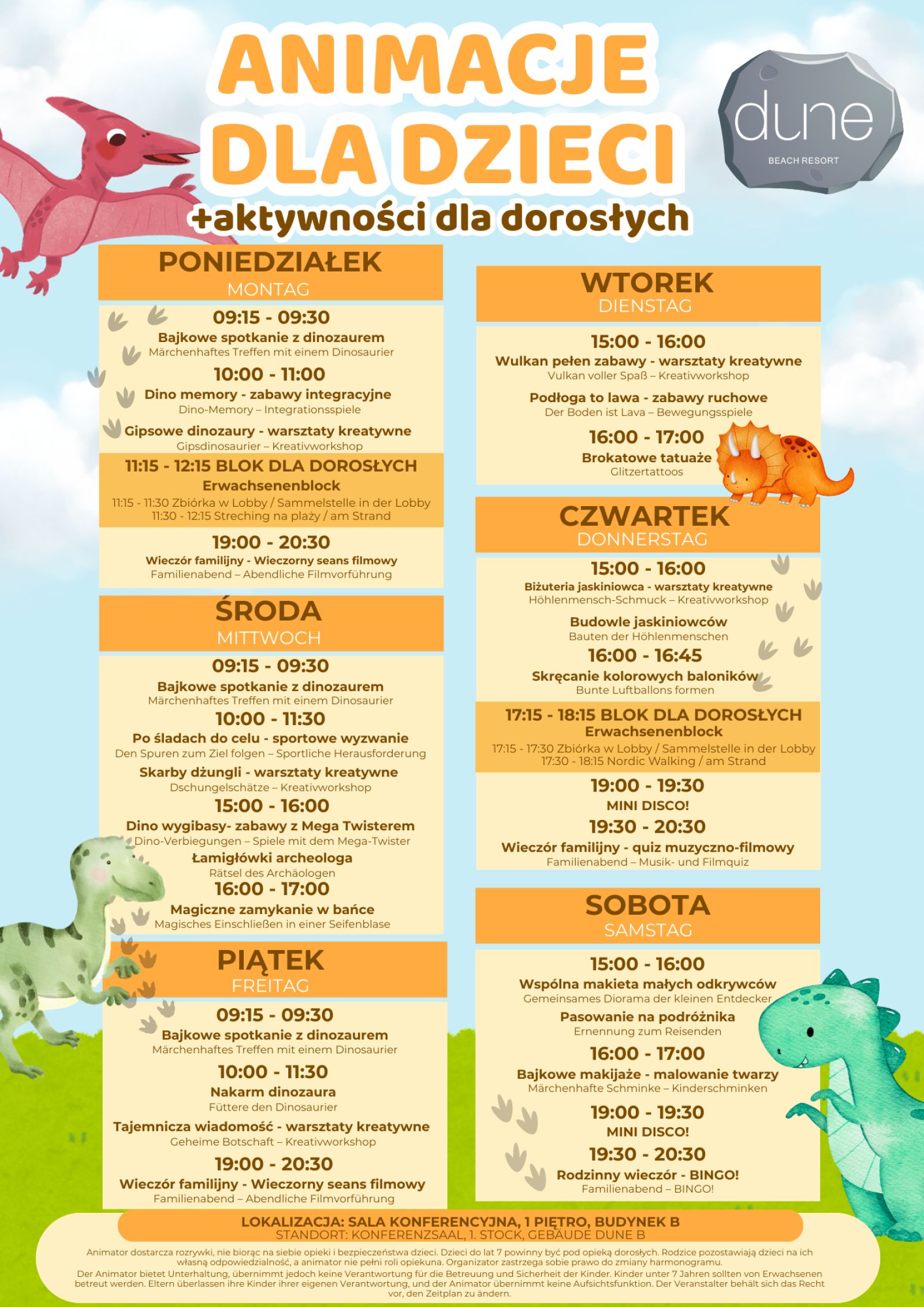 - Animator dostarcza rozrywki, nie biorąc na siebie opieki i bezpieczeństwa dzieci. Dzieci do lat 7 powinny być pod opieką dorosłych. Rodzice pozostawiają dzieci na ich własną odpowiedzialność, a animator nie pełni roli opiekuna. Organizator zastrzega sobie prawo do zmiany harmonogramu.