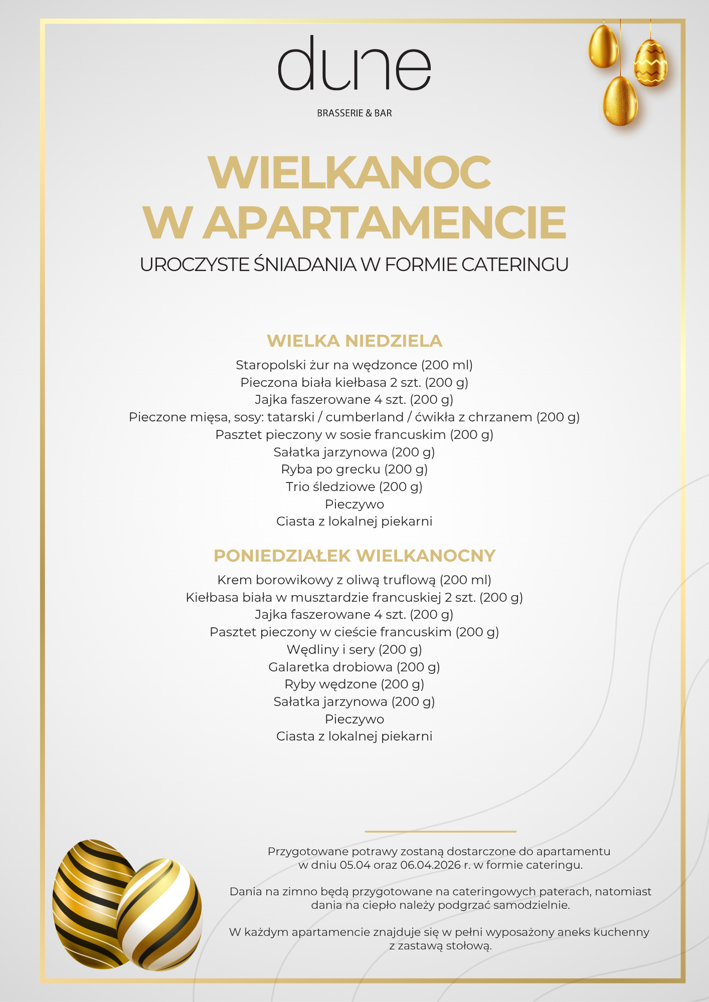 - UROCZYSTE ŚNIADANIA WIELKANOCNE W APARTAMENCIE w gronie najbliższych w prywatnej przestrzeni. Przygotowane przez Szefa Kuchni potrawy zostaną dostarczone do apartamentu w Wielką Niedzielę oraz Poniedziałek Wielkanocny w formie cateringu do samodzielnego podgrzania,*