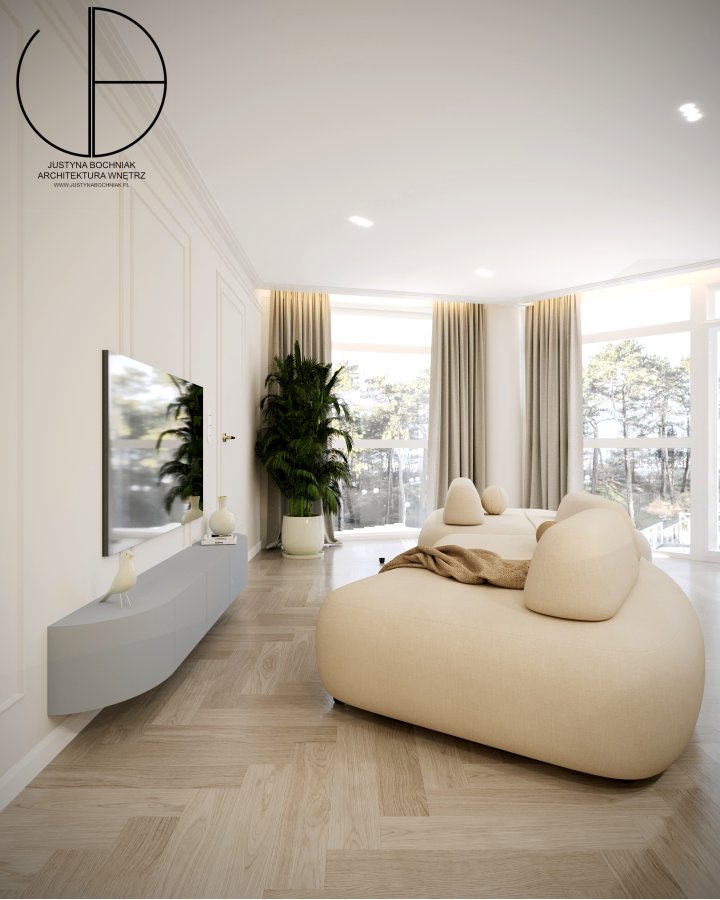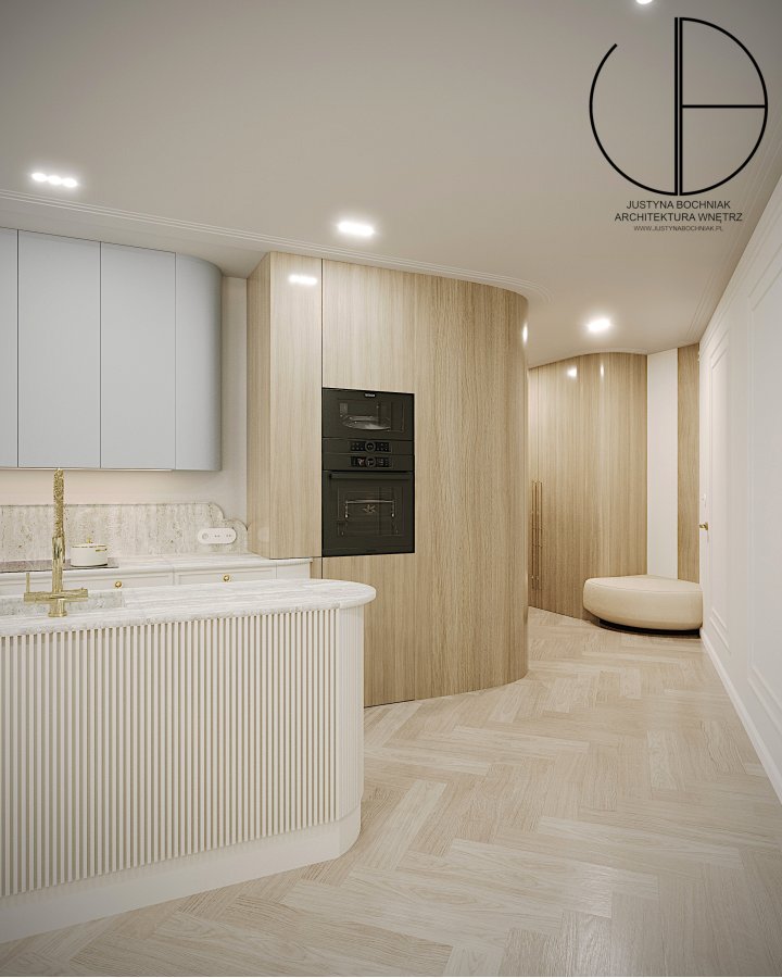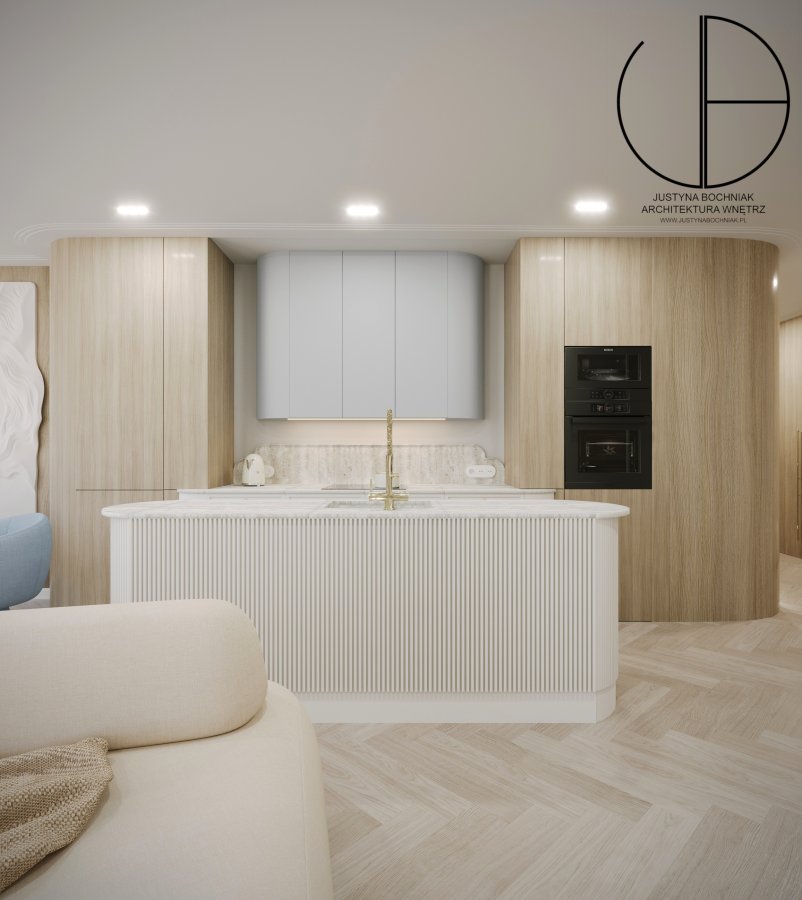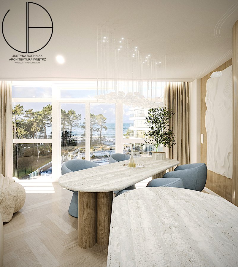 Apartament zachwyca jasnymi, spójnymi wnętrzami utrzymanymi w nowoczesnym stylu. Sercem nieruchomości jest duży salon z aneksem kuchennym, którego panoramiczne okna oferują niepowtarzalny widok na morze. Strefa dzienna obejmuje wygodną część wypoczynkową, przestrzeń jadalnianą oraz w pełni wyposażoną kuchnię z elegancką wyspą, która dodaje wnętrzu lekkości i wyjątkowego charakteru.